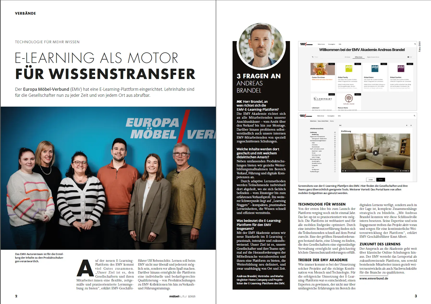 Der Europa Möbel-Verbund (EMV) hat eine E-Learning-Plattform eingerichtet. Lehrinhalte sind für die Gesellschafter nun zu jeder Zeit und von jedem Ort aus abrufbar.