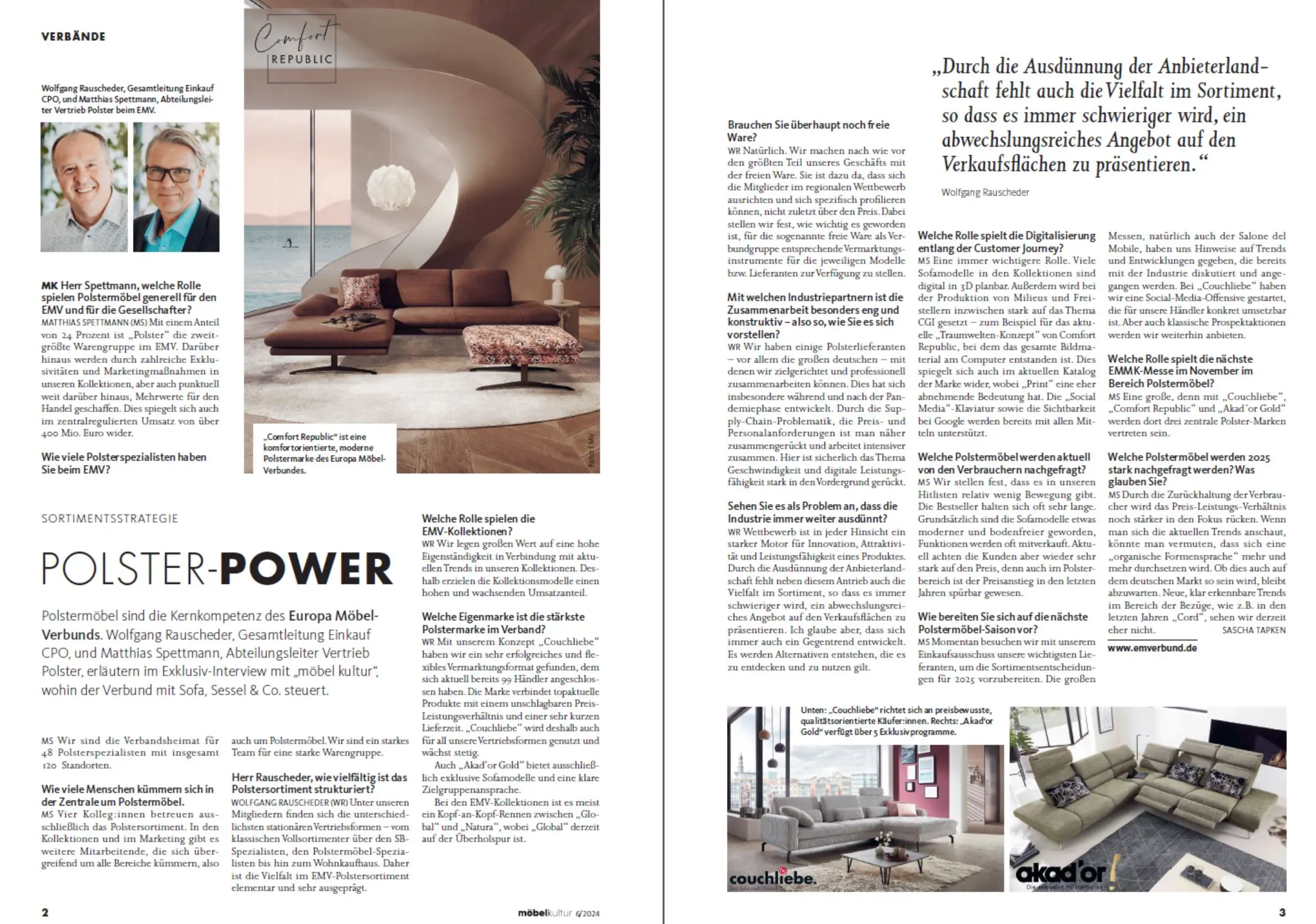 Der Europa Möbel-Verbund verfeinert das Polster-Portfolio auf allen Ebenen: Das Marketing wird emotionaler, das Sortiment schlagkräftiger und der Vertriebsansatz technologischer. Warum sich dieser Weg für die Händler im EMV auszahlt, erläutert der Spartenmanager Matthias Spettmann.