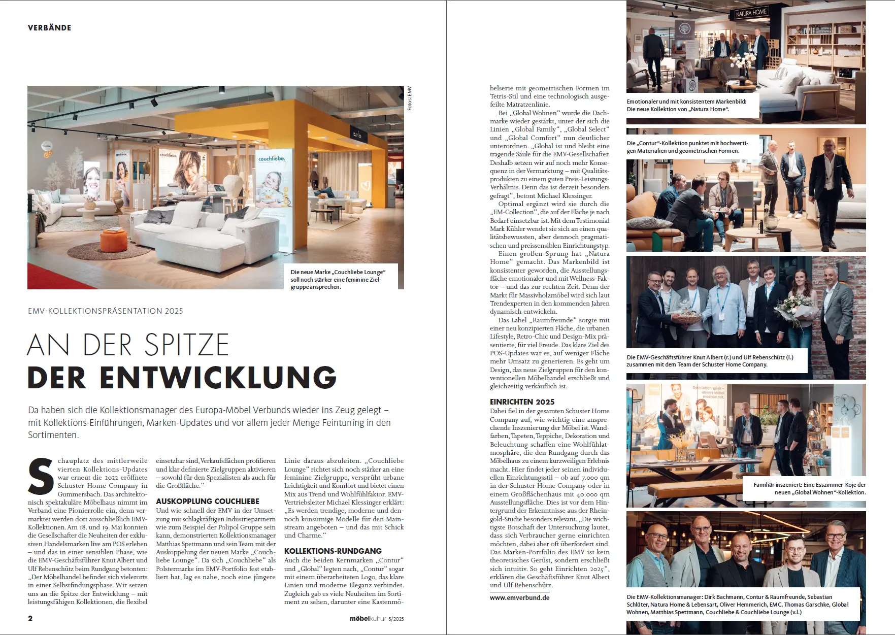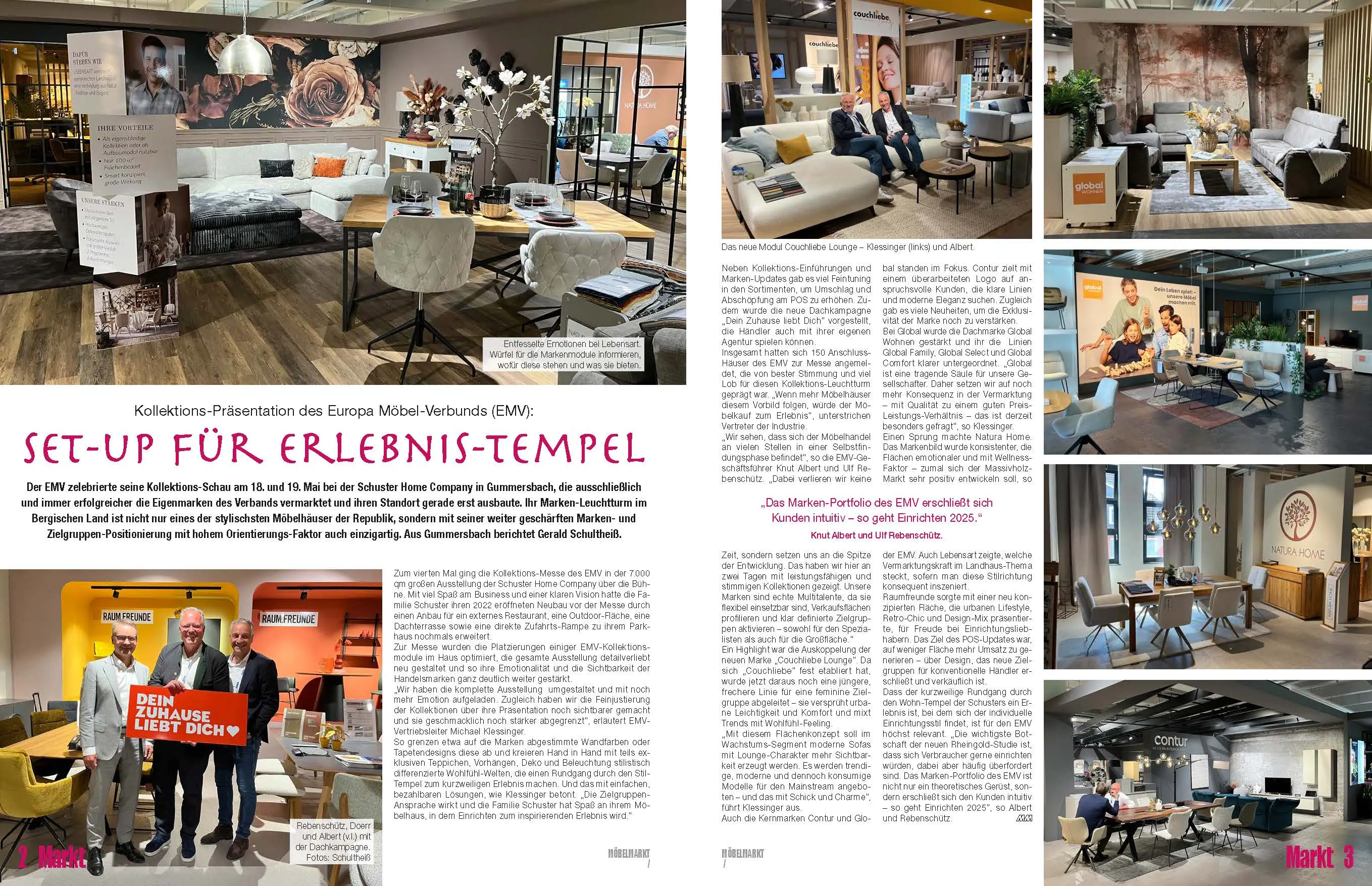 Der EMV zelebrierte seine Kollektions-Schau am 18. und 19. Mai bei der Schuster Home Company in Gummersbach, die ausschließlich und immer erfolgreicher die Eigenmarken des Verbands vermarktet und ihren Standort gerade erst ausbaute. Ihr Marken-Leuchtturm im Bergischen Land ist nicht nur eines der stylischsten Möbelhäuser der Republik, sondern mit seiner weiter geschärften Marken- und Zielgruppen-Positionierung mit hohem Orientierungs-Faktor auch einzigartig. Aus Gummersbach berichtet Gerald Schultheiß.