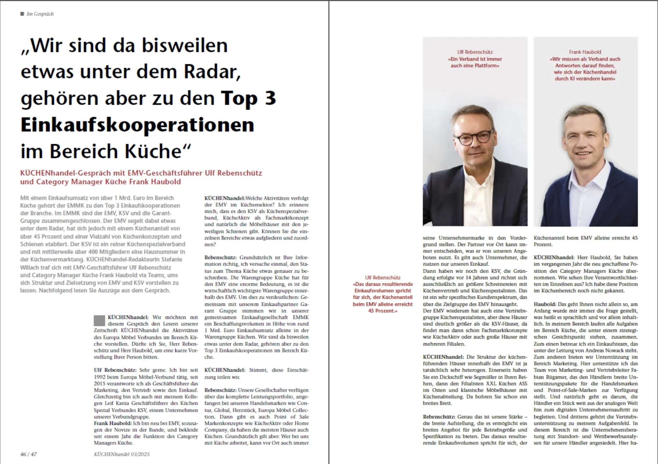 „Wir sind da bisweilen etwas unter dem Radar, gehören aber zu den Top 3 Einkaufskooperationen im Bereich Küche" Mit einem Einkaufsumsatz von über 1 Mrd. Euro im Bereich Küche gehört der EMMK zu den Top 3 Einkaufskooperationen der Branche. Im EMMK sind der EMV, KSV und die GarantGruppe zusammengeschlossen. Der EMV segelt dabei etwas unter dem Radar, hat sich jedoch mit einem Küchenanteil von über 45 Prozent und einer Vielzahl von Küchenkonzepten und Schienen etabliert.
