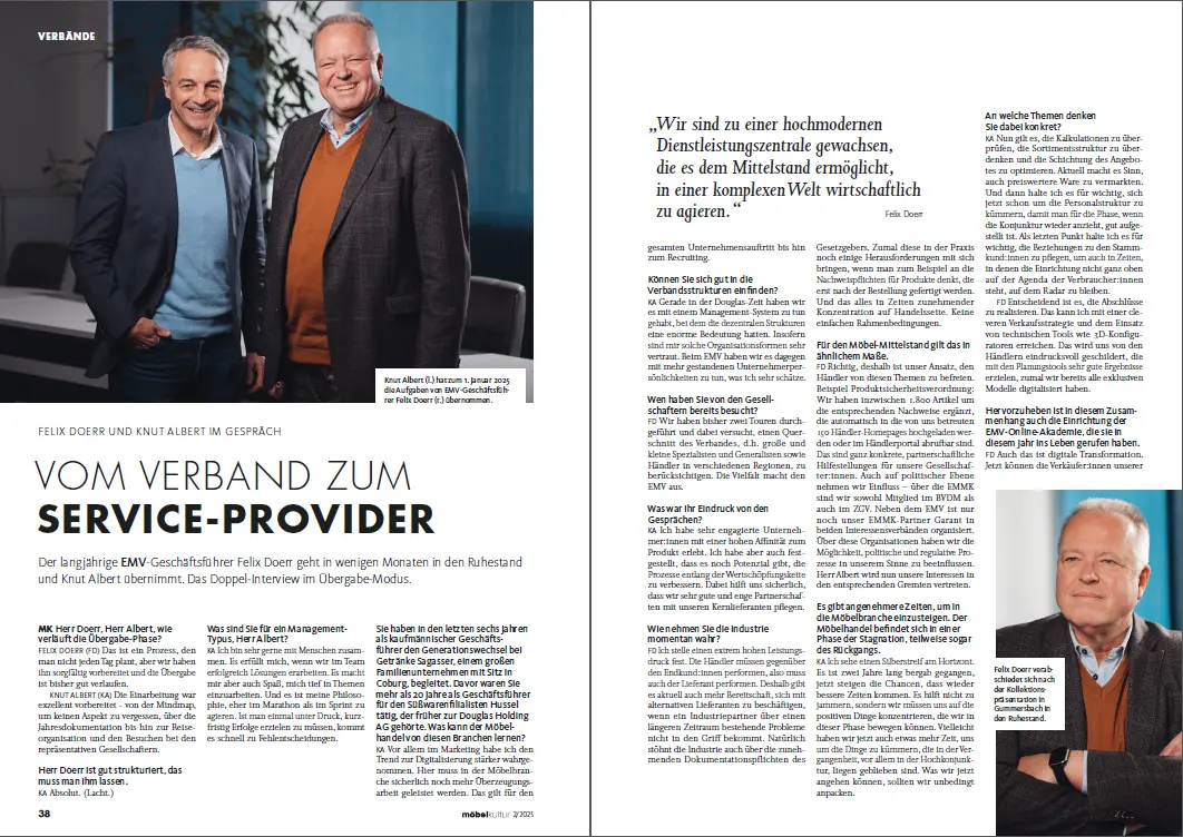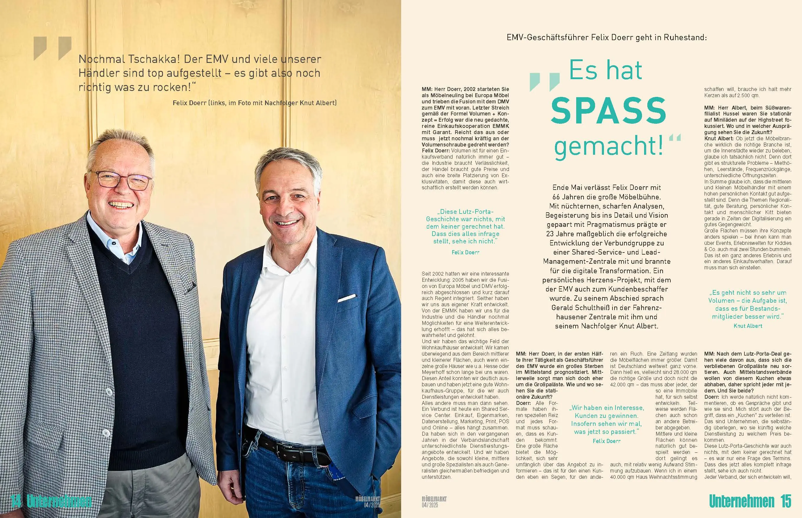 Mai verlässt Felix Doerr mit 66 Jahren die große Möbelbühne. Mit nüchternen, scharfen Analysen, Begeisterung bis ins Detail und Vision gepaart mit Pragmatismus prägte er 23 Jahre maßgeblich die erfolgreiche Entwicklung der Verbundgruppe zu einer Shared-Service- und Lead-Management-Zentrale mit und brannte für die digitale Transformation. Ein persönliches Herzens-Projekt, mit dem der EMV auch zum Kundenbeschaffer wurde. Zu seinem Abschied sprach Gerald Schultheiß in der Fahrenzhausener Zentrale mit ihm und seinem Nachfolger Knut Albert.