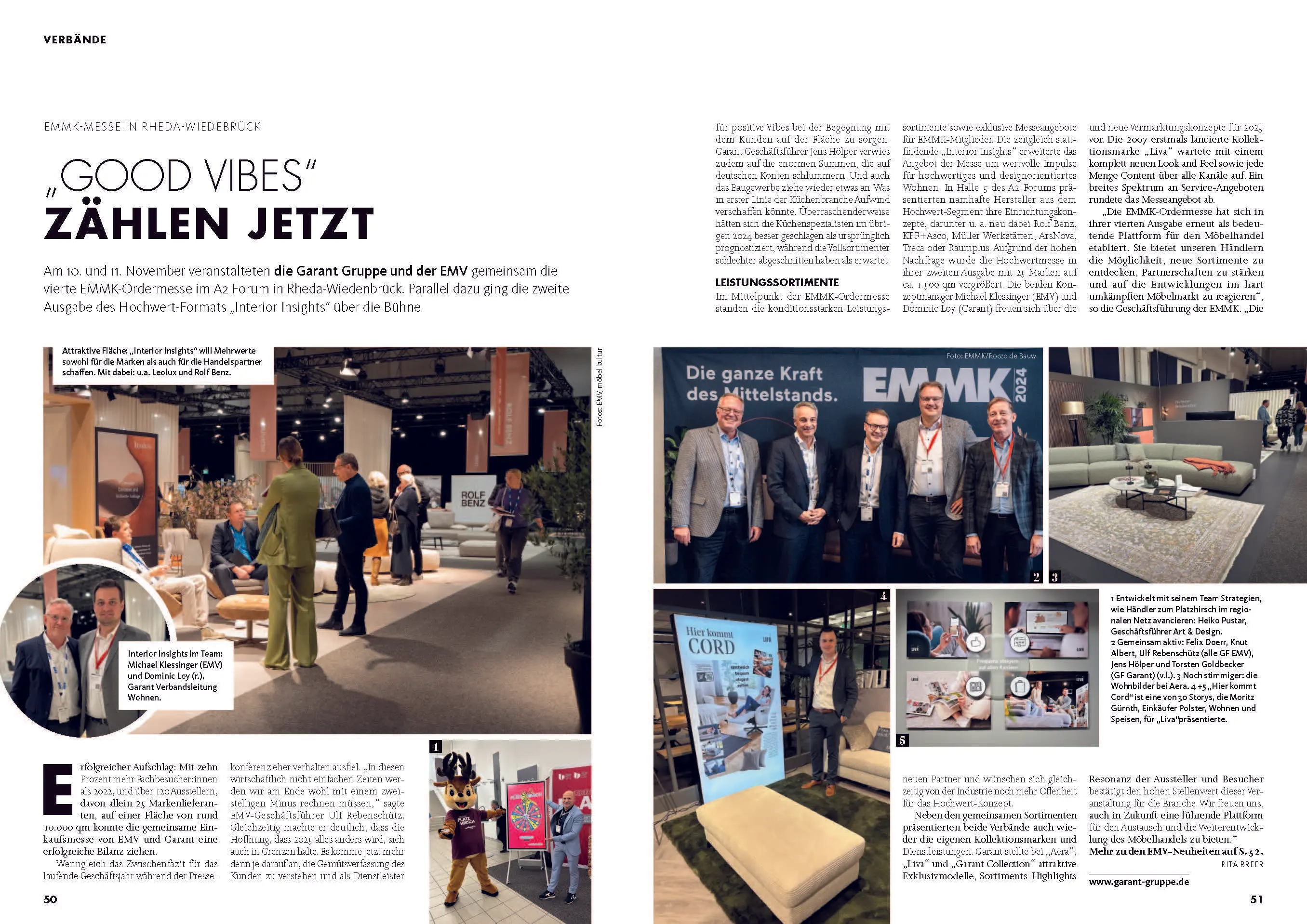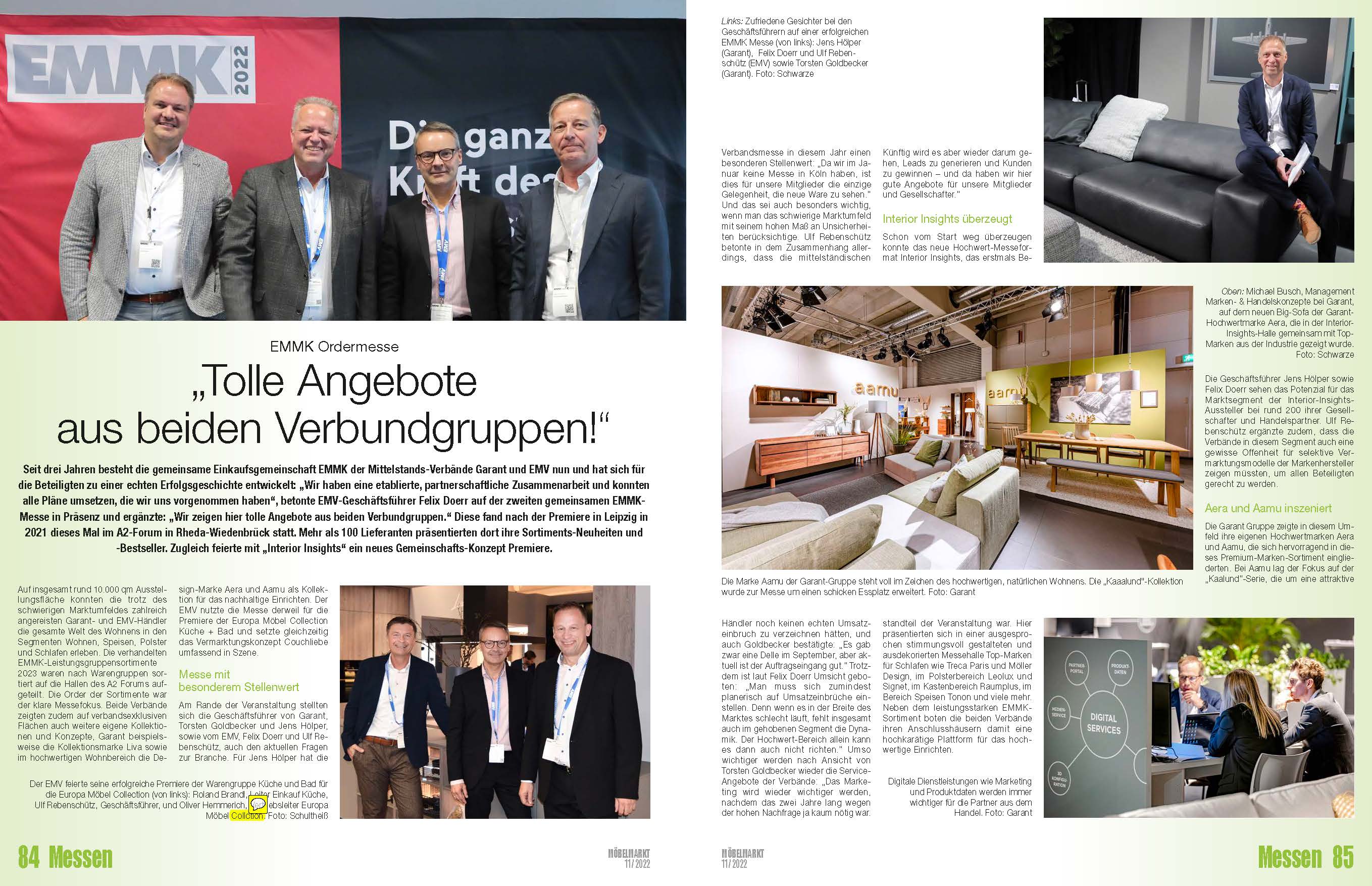 Am 10. und 11. November veranstalteten die Garant Gruppe und der EMV gemeinsam die vierte EMMK-Ordermesse im A2 Forum in Rheda-Wiedenbrück. Parallel dazu ging die zweite Ausgabe des Hochwert-Formats „Interior Insights“ über die Bühne.