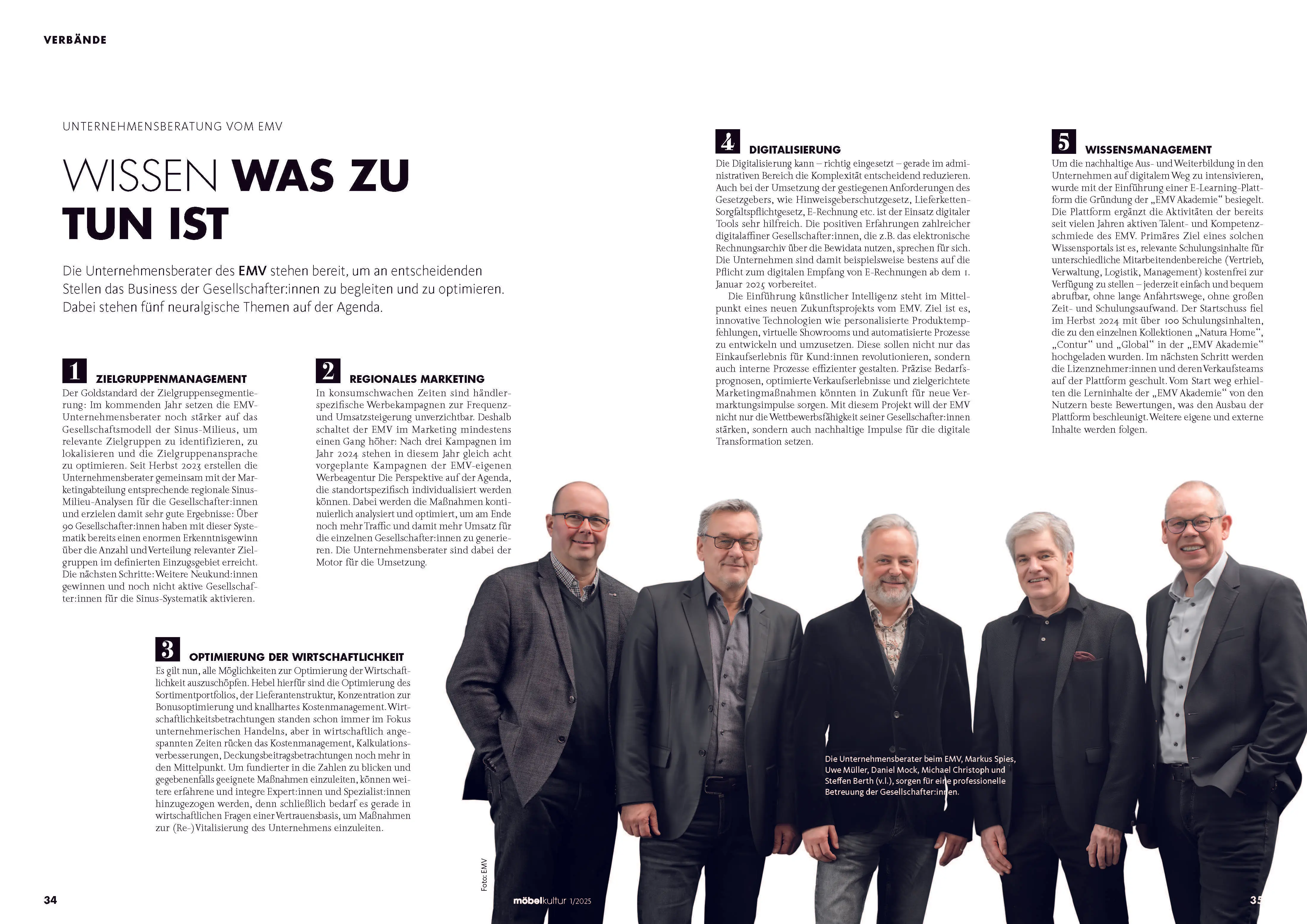 Die Unternehmensberater des EMV stehen bereit, um an entscheidenden Stellen das Business der Gesellschafter:innen zu begleiten und zu optimieren. Dabei stehen fünf neuralgische Themen auf der Agenda.