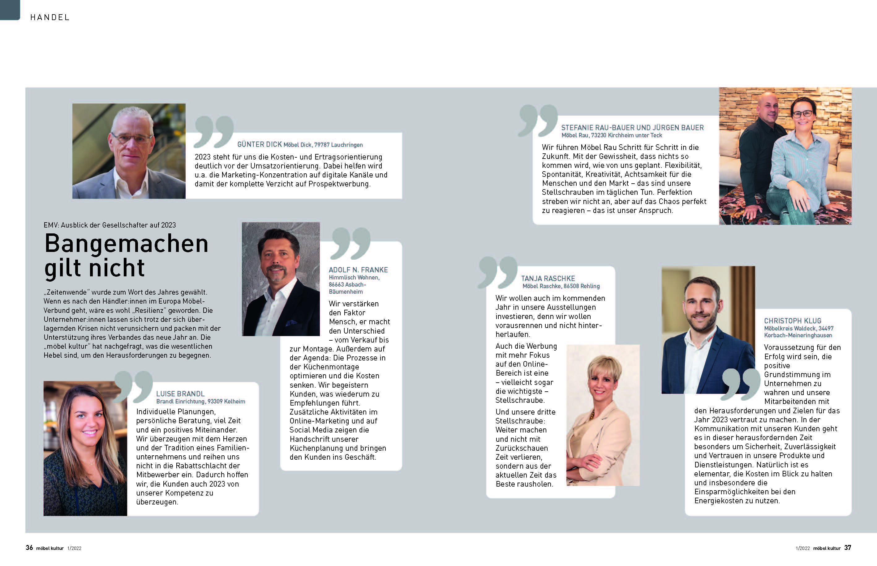 Bangemachen gilt nicht „Zeitenwende“ wurde zum Wort des Jahres gewählt. Wenn es nach den Händler:innen im Europa Möbel-Verbund geht, wäre es wohl „Resilienz“ geworden. Die Unternehmer:innen lassen sich trotz der sich über-lagernden Krisen nicht verunsichern und packen mit der Unterstützung ihres Verbandes das neue Jahr an. Die „möbel kultur“ hat nachgefragt, was die wesentlichen Hebel sind, um den Herausforderungen zu begegnen.