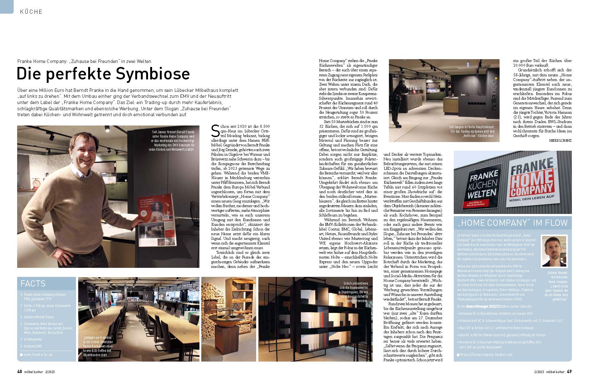 Über eine Million Euro hat Berndt Franke in die Hand genommen, um sein Lübecker Möbelhaus komplett „auf links zu drehen“. Mit dem Umbau einher ging der Verbandswechsel zum EMV und der Neuauftritt unter dem Label der „Franke Home Company“. Das Ziel: ein Trading-up durch mehr Kauferlebnis, schlagkräftige Qualitätsmarken und ebensolche Werbung. Unter dem Slogan „Zuhause bei Freunden“ treten dabei Küchen- und Wohnwelt getrennt und doch emotional verbunden auf.