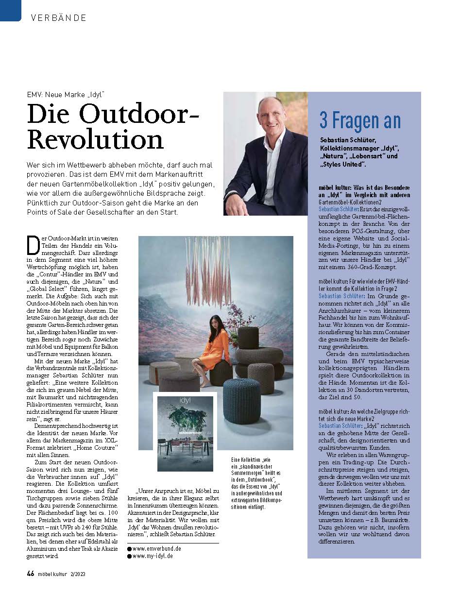 Wer sich im Wettbewerb abheben möchte, darf auch mal provozieren. Das ist dem EMV mit dem Markenauftritt der neuen Gartenmöbelkollektion „Idyl“ positiv gelungen, wie vor allem die außergewöhnliche Bildsprache zeigt. Pünktlich zur Outdoor-Saison geht die Marke an den Points of Sale der Gesellschafter an den Start.