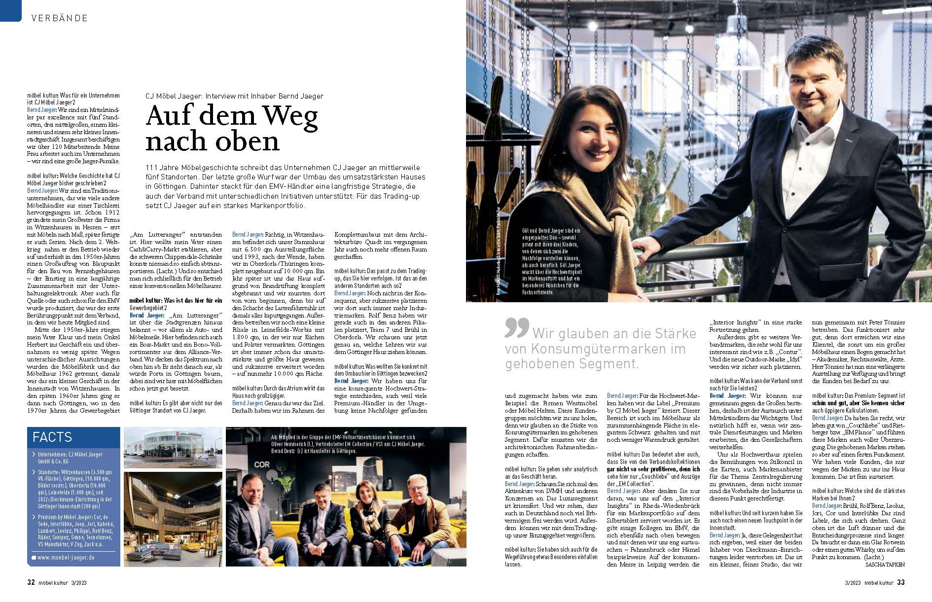 111 Jahre Möbelgeschichte schreibt das Unternehmen CJ Jaeger an mittlerweile fünf Standorten. Der letzte große Wurf war der Umbau des umsatzstärksten Hauses in Göttingen. Dahinter steckt für den EMV-Händler eine langfristige Strategie, die auch der Verband mit unterschiedlichen Initiativen unterstützt: Für das Trading-up setzt CJ Jaeger auf ein starkes Markenportfolio.