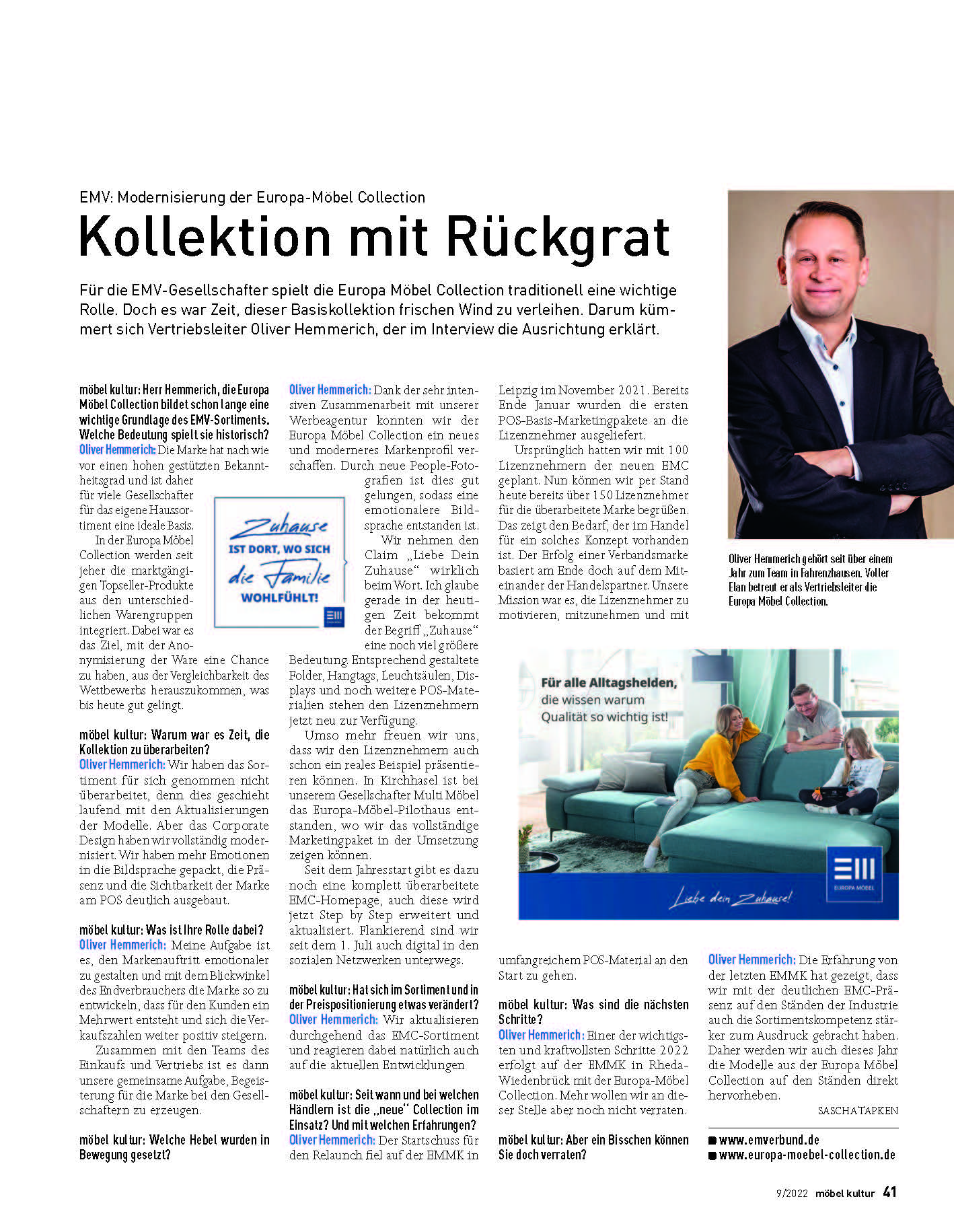 Für die EMV-Gesellschafter spielt die Europa Möbel Collection traditionell eine wichtige Rolle. Doch es war Zeit, dieser Basiskollektion frischen Wind zu verleihen. Darum kümmert sich Vertriebsleiter Oliver Hemmerich, der im Interview die Ausrichtung erklärt.