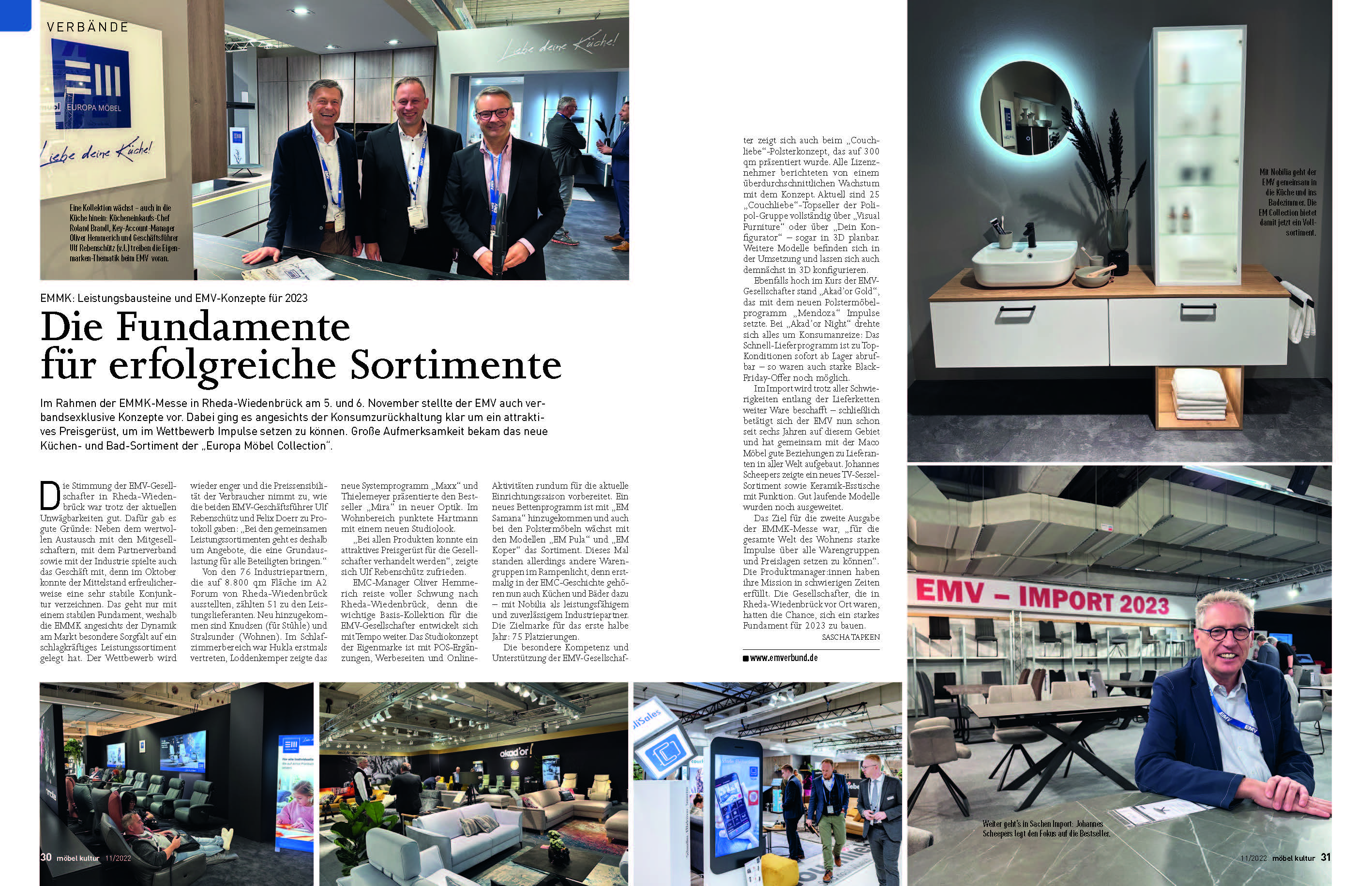 „Wir sind da bisweilen etwas unter dem Radar, gehören aber zu den Top 3 Einkaufskooperationen im Bereich Küche“ Mit einem Einkaufsumsatz von über 1 Mrd. Euro im Bereich Küche gehört der EMMK zu den Top 3 Einkaufskooperationen der Branche. Im EMMK sind der EMV, KSV und die GarantGruppe zusammengeschlossen. Der EMV segelt dabei etwas unter dem Radar, hat sich jedoch mit einem Küchenanteil von über 45 Prozent und einer Vielzahl von Küchenkonzepten und Schienen etabliert.